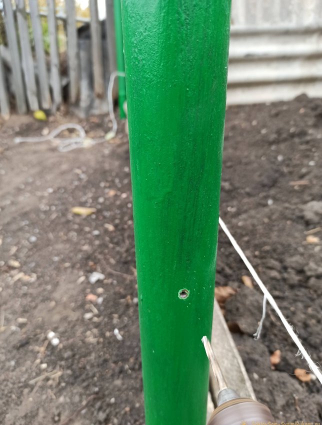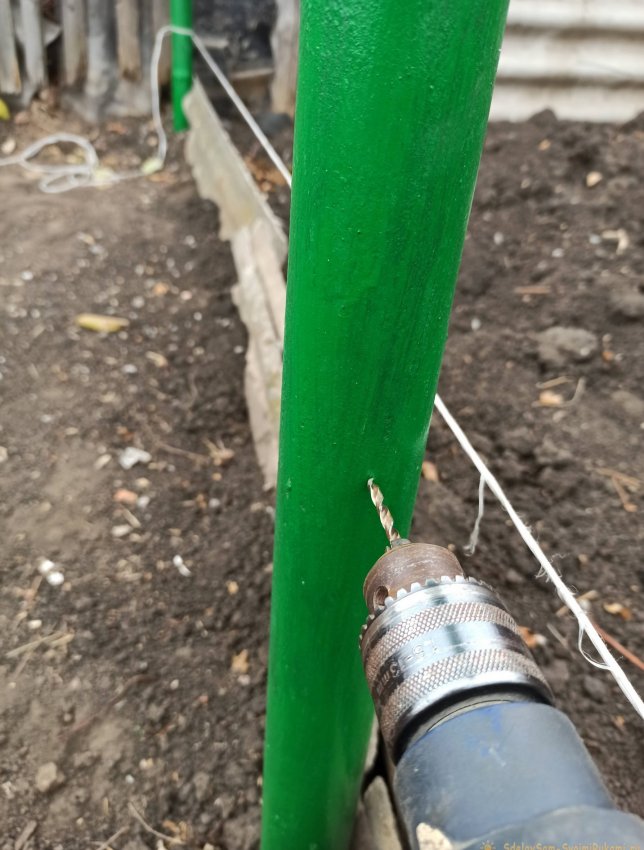 Чтобы завести трос в столбики в них с помощью дрели на выбранной высоте делаются отверстия.