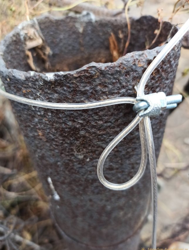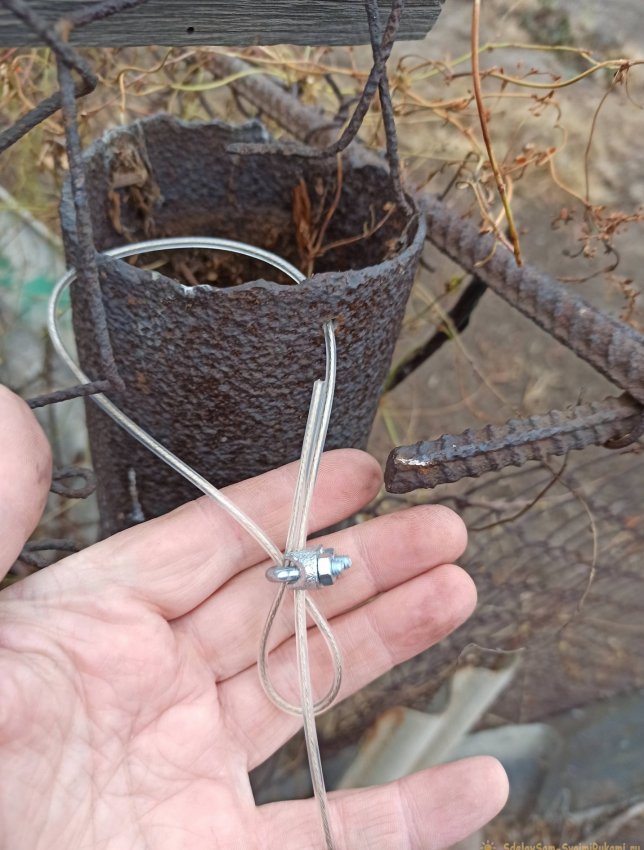 После заведения троса он натягивается и фиксируется на последнем столбике хомутом, точно также как и на первом.