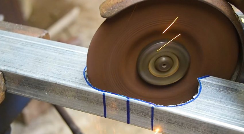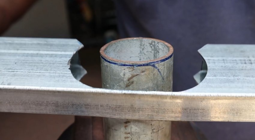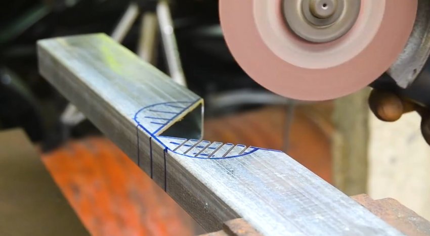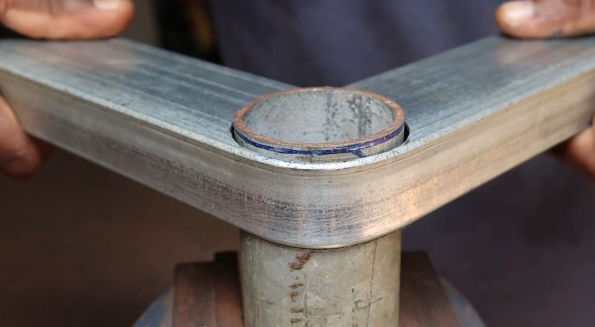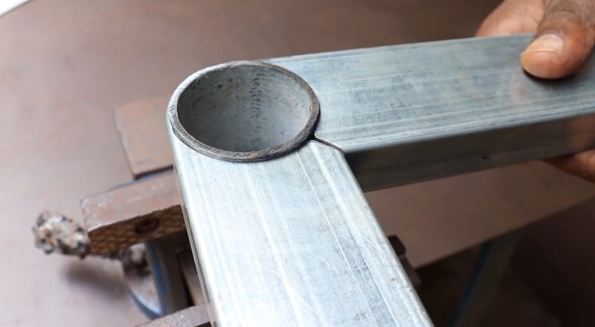 Обхватываем вырезом в профильной трубе круглую и сводим концы первой, чтобы вырез плотно обхватил круглую трубу, а стороны образовали прямой угол.