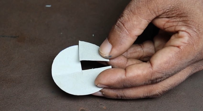Складываем вырезанный картонный круг пополам. Делаем надрез по линии сгиба до центра круга. Сгибаем сектор (1/4 часть круга) по надрезу и отрезаем его от круга.