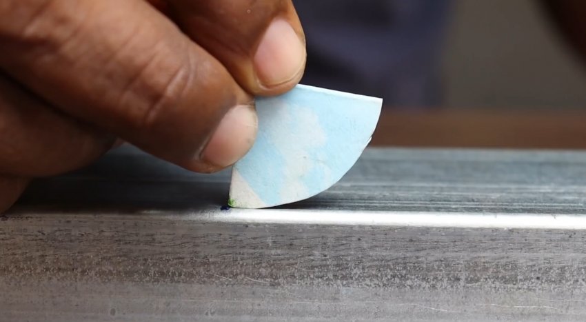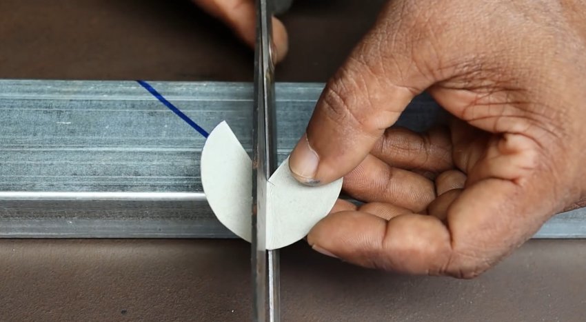 Делаем отметку на грани профильной трубы, и на нее устанавливаем начало дуги картонного сектора и обкатываем его по грани трубы. Там, где дуга заканчивается, также делаем отметку.