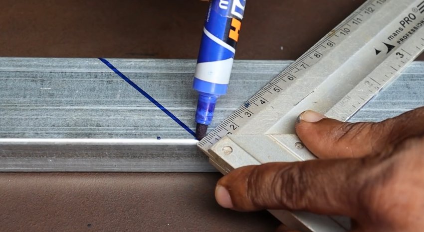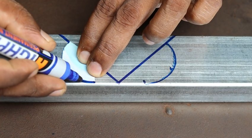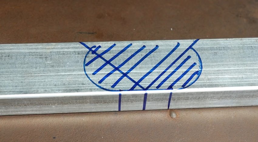 Замеряем расстояние между точками и находим между ними середину, которую также отмечаем. Из нее проводим по стороне профильной трубы две линии под 45 градусов.