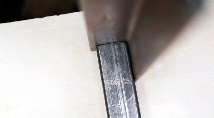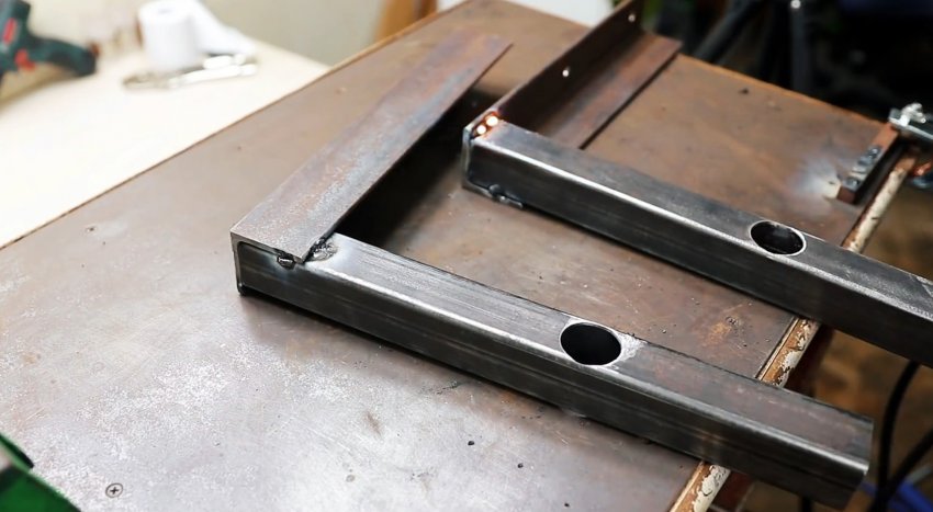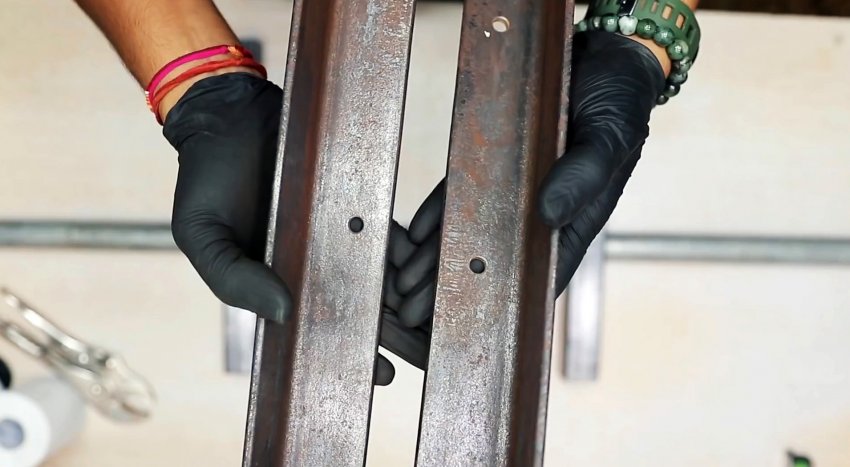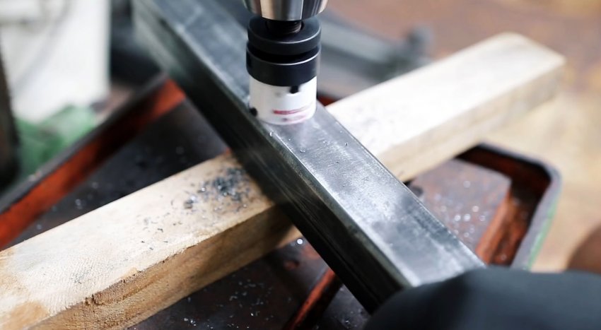 В одинаковых по длине профильных квадратных трубах, выбранных по прочностным показателям, сверлим корончатым сверлом на сверлильном станке сквозные отверстия в противоположных стенках на расчетном расстоянии от концов.
