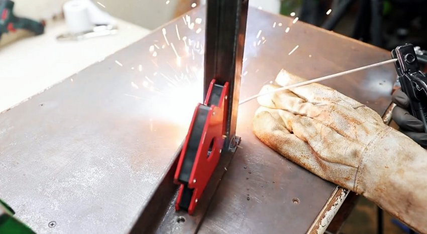 С помощью магнитного угольника-держателя выставляем прямой угол и в таком положении привариваем квадратные трубы к уголкам по всем линиям контакта.