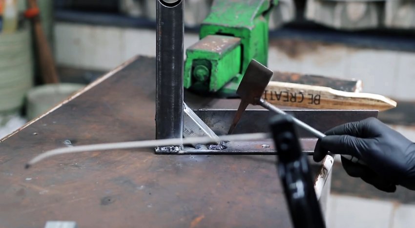 Для придания соединениям гарантированной прочности и жесткости привариваем к сопряженным уголкам и трубам в местах соединения усиливающие элементы наподобие косынок из отрезков профильной квадратной трубы. Отбиваем образовавшийся при сварке шлак молотком с узким отбойником и при необходимости зачищаем сварные швы.
