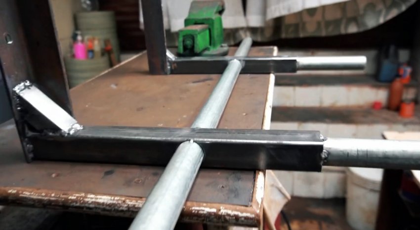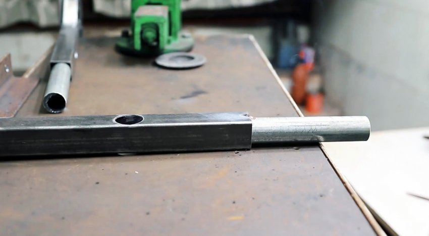 Вставляем в отверстия профильных квадратных труб стальную круглую трубу соответствующего диаметра и длины.
