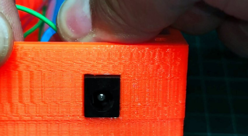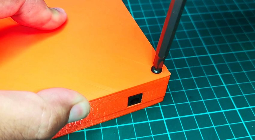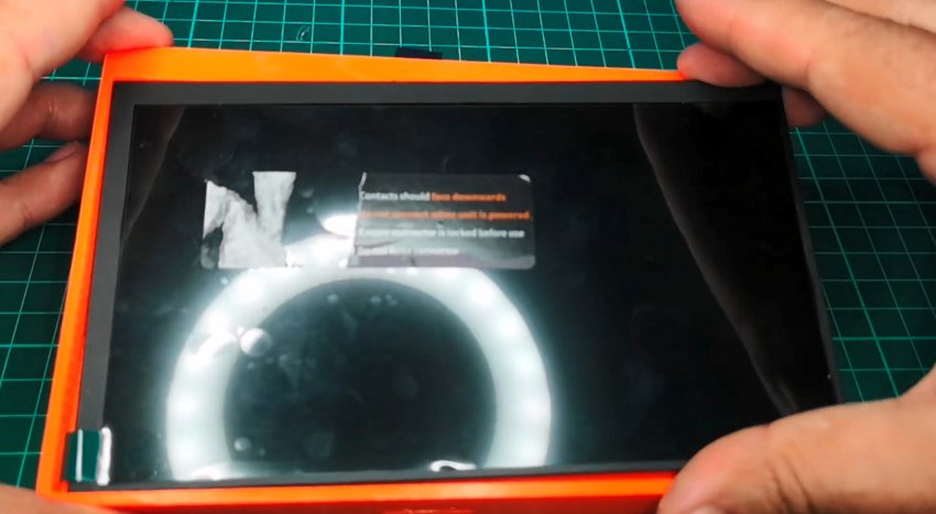 На переднюю панель приклеиваем дисплей, шлейф заводим внутрь через прорезь.