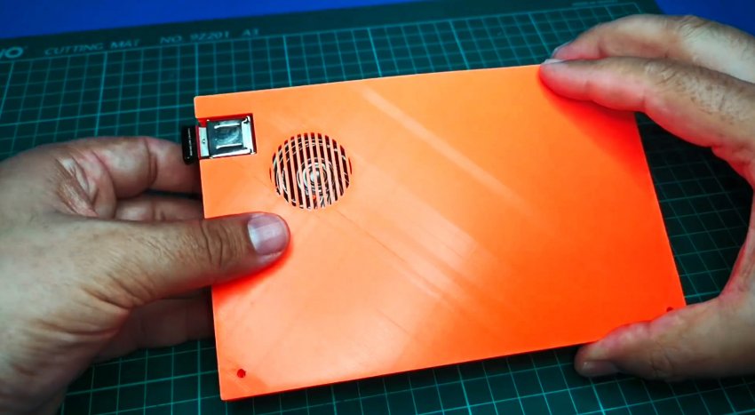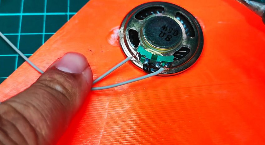 Выход с усилителя подключим к динамической головке, которая заранее приклеена на заднюю крышку.