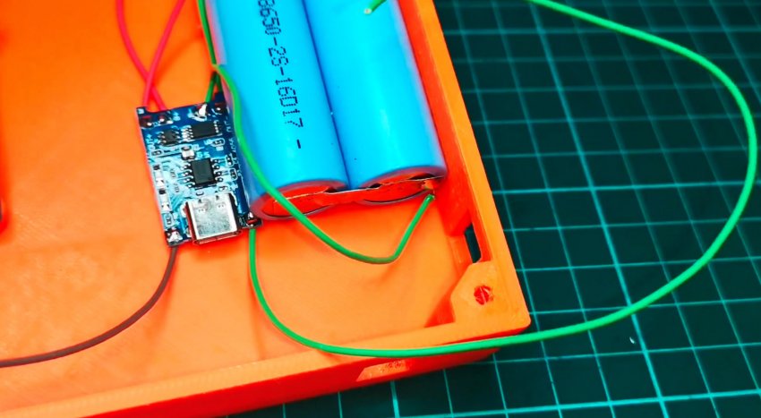 При помощи двустороннего скотча крепим АКБ с платой зарядки к корпусу.