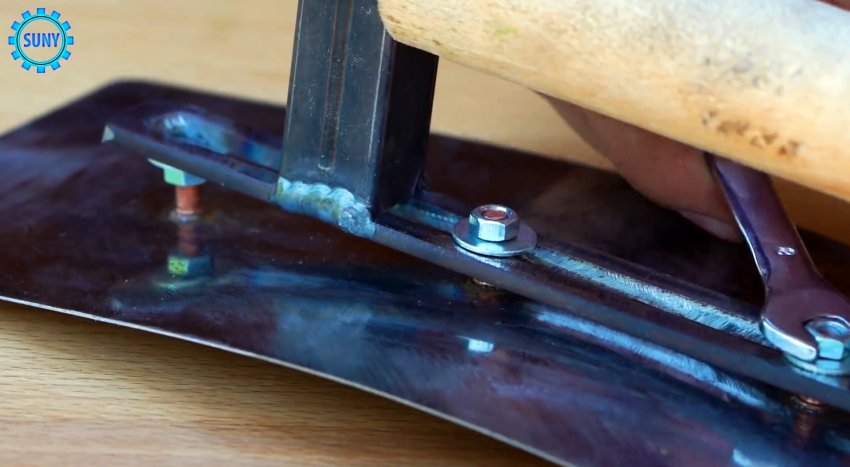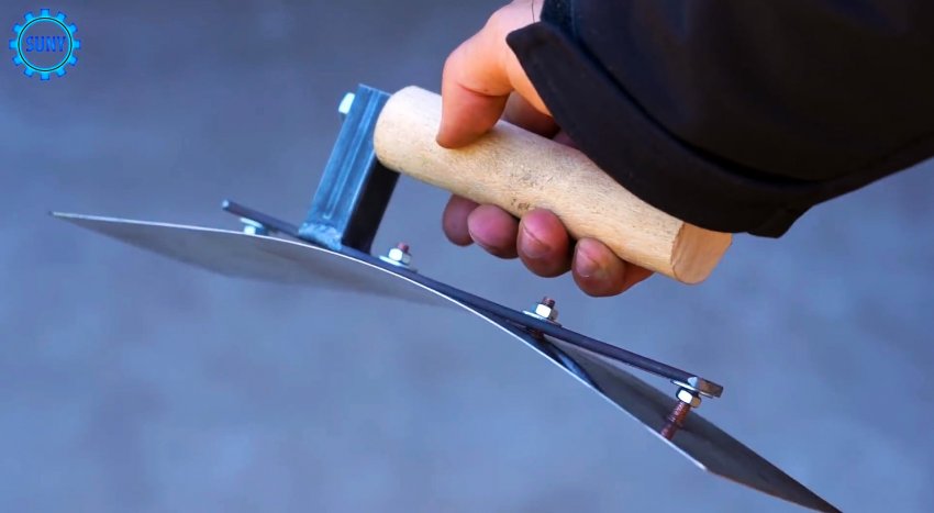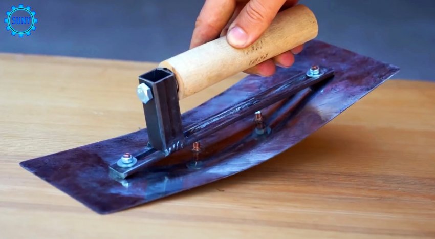 Затем давим на ручку, при этом рабочая пластина выгибается наружу, и второй крайний болт входит в прорезь пластины, на который после шайбы также накручиваем гайку. Мы получили выпуклую рабочую поверхность кельмы.