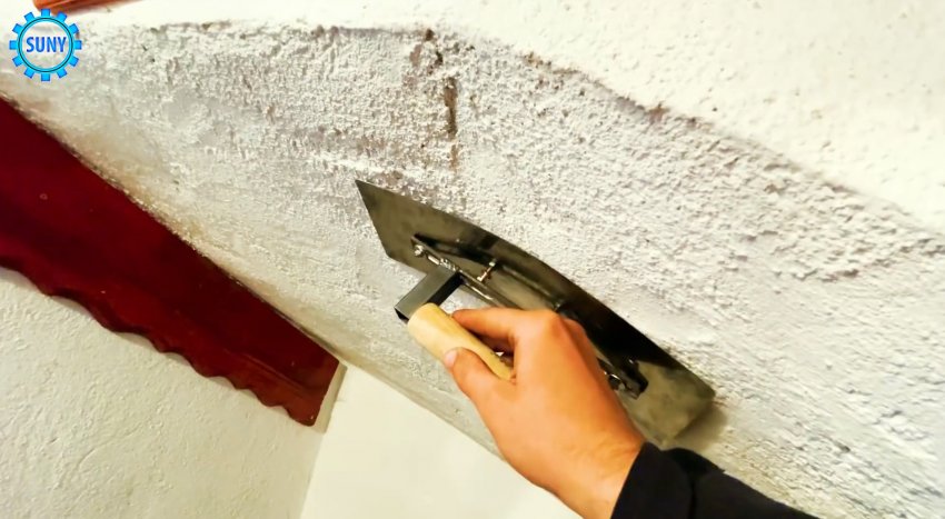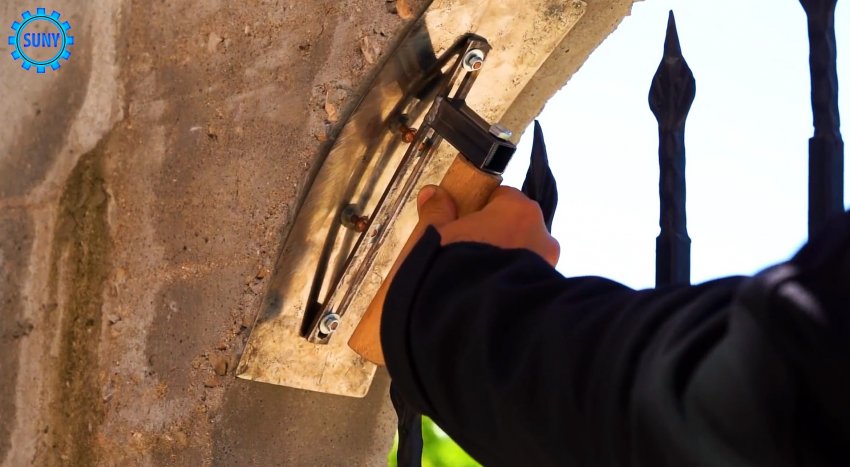 Подтягиваем их ключом и получаем вогнутую рабочую поверхность мастерка. В результате одним инструментом можно оштукатурить два разных архитектурных элемента.