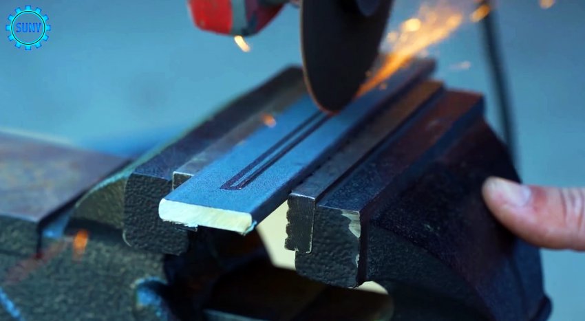 Закрепляем отмеренный отрезок пластины в тисках, намечаем по центру контур продольного замкнутого паза и вырезаем его с помощью болгарки.