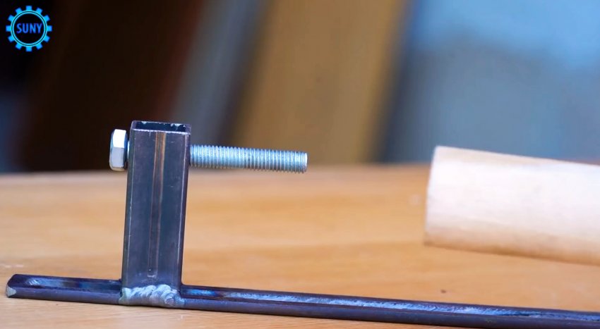 Соразмерно длине болта отрезаем от деревянного стержня необходимый отрезок и по центру продольно с одного торца сверлим глухое отверстие немного длиннее стержня болта. Тем же метчиком нарезаем в деревянном элементе резьбу и закручиваем его на болт с натягом.