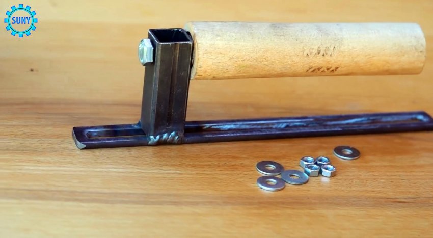 Заводим ближний к стойке ручки болт в прорезь стальной полосы и, надев шайбу, накручиваем гайку.