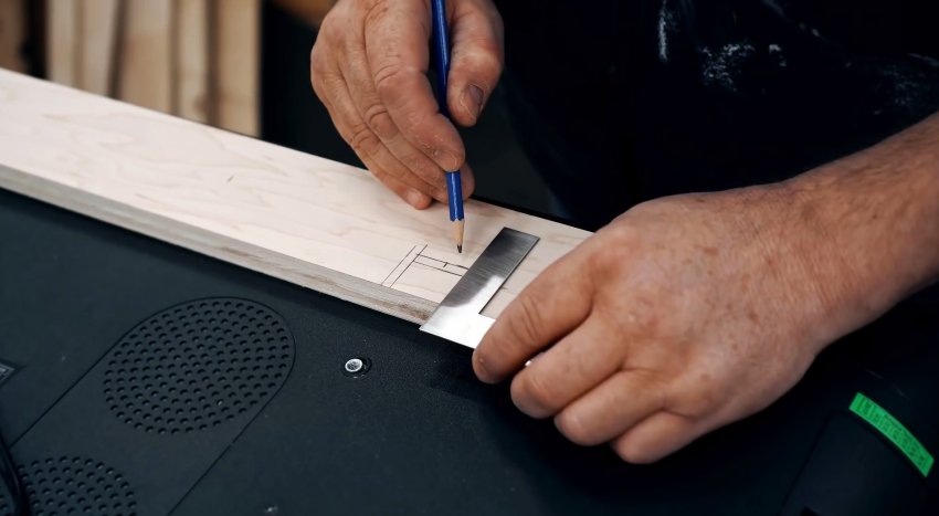 Отмечаем на фанерной полосе промежуток, соответствующий межцентровому расстоянию между болтами. На его концах намечаем одинаковые контуры двух ломаных линий под фрезеровку, в которые будут на готовой самоделке входить стержни болтов.