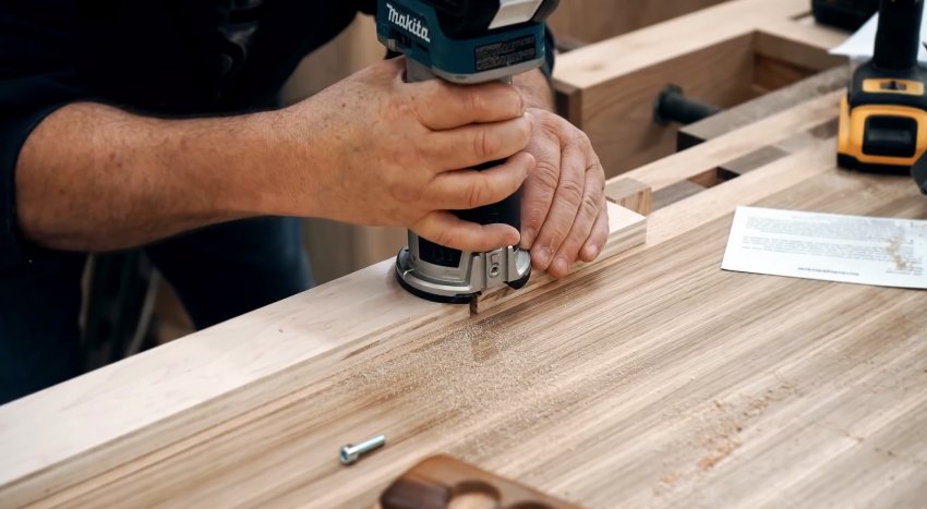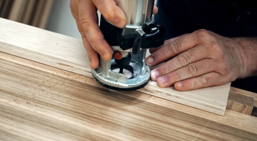 Закрепляем полосу многослойной фанеры в столярных тисках и фрезеруем две ломаные канавки по разметке ручным электрическим фрезером на небольшую глубину.