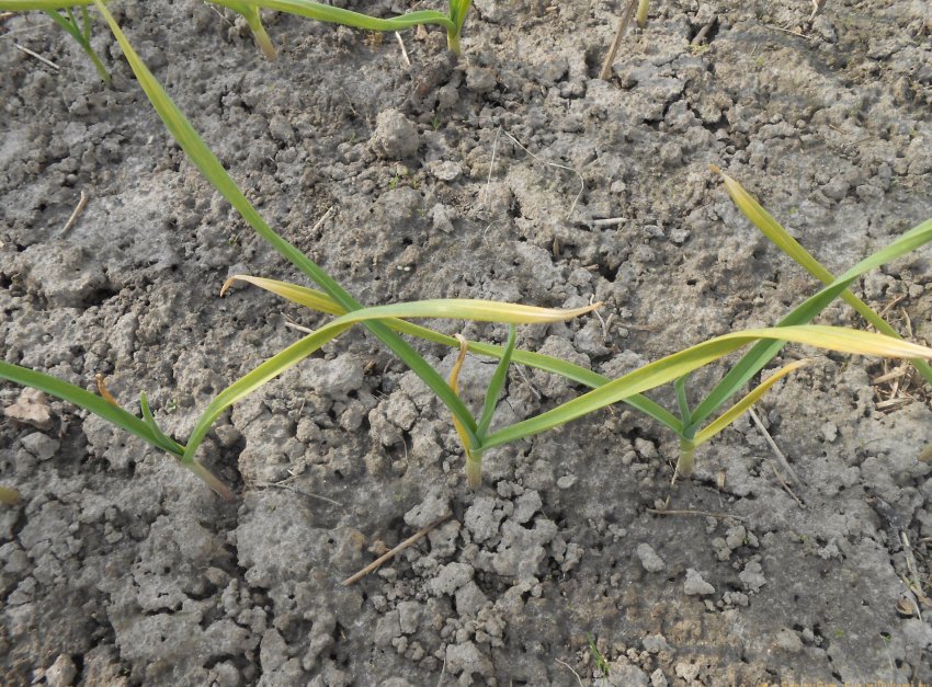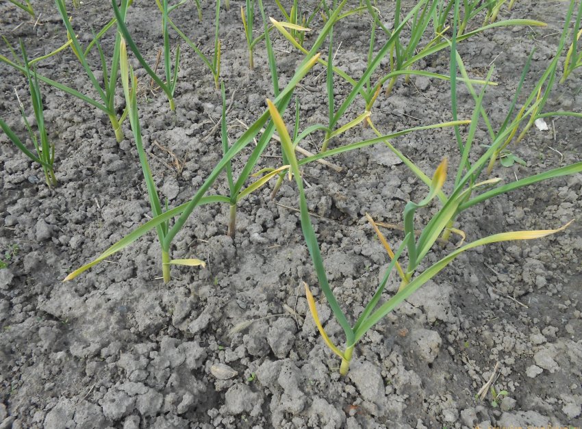 Азотное голодание всегда проявляется пожелтением нижних листьев и кончиков перьев. Такую картину весной часто наблюдают неопытные огородники, считающие внесение удобрений под острый овощ не обязательным мероприятием. А ведь именно в условиях нехватки азота чесночные кусты быстро стареют, не успевая полностью развить подземную часть и сформировать крупные луковицы.