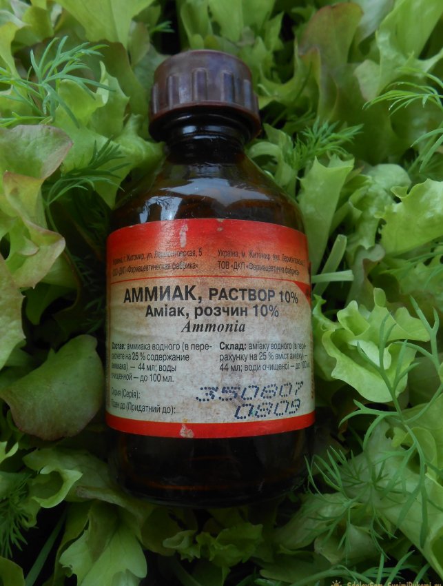 Аптечную прозрачную жидкость с едким и резким запахом разводят в воде (без хлора) из расчета 2 ст. л. на 10 л воды. А для нейтрализации щелочи и повышения эффективности в аммиачный раствор обязательно добавляют кристаллы лимонной кислоты (1 чайная ложка на ведро подкормки).