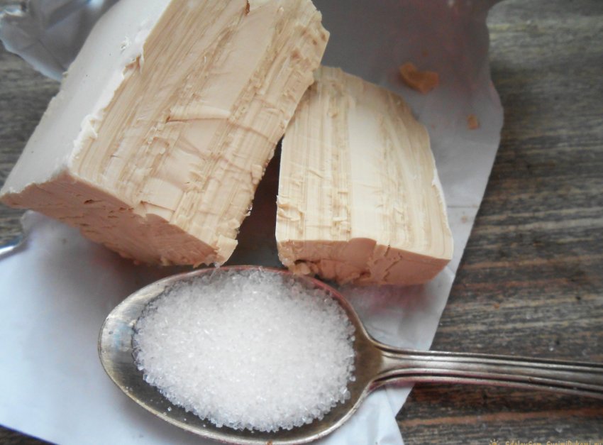 В трехлитровой банке теплой воды (жидкость наливать не доверху) распустите столовую ложку сухих дрожжей и две столовые ложки с верхом сахарного песка. Вместо сухих дрожжей можно использовать прессованные из расчета 100 г на трехлитровую банку бражки.