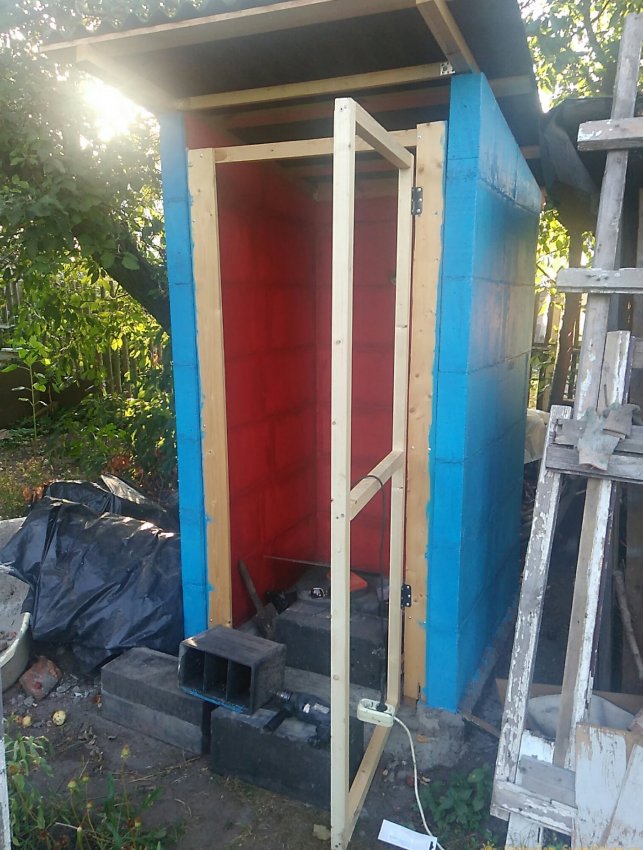 Как только дверь была готова, я приступил к заключительной части строительства: задул все отверстия монтажной пеной, установил сиденье унитаза, повесил крючки и т.п.