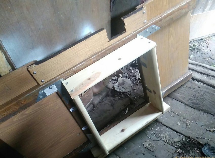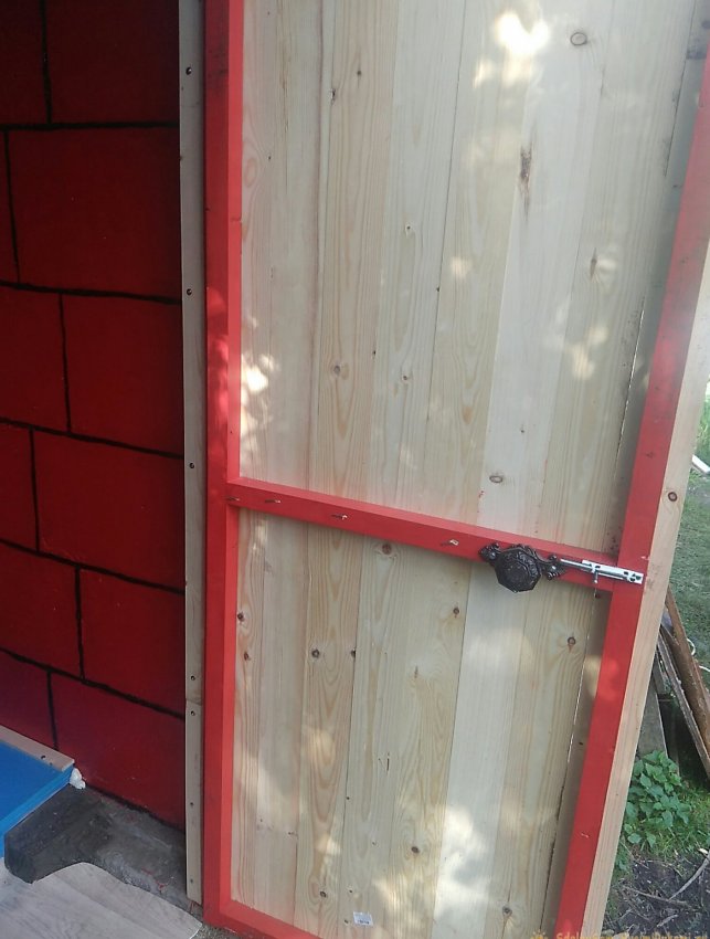 Затем я прикрепил на шурупы с анкерами два бруска в передней части туалета, для крепежа двери. Сделал для нее облегченный каркас.