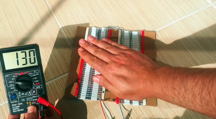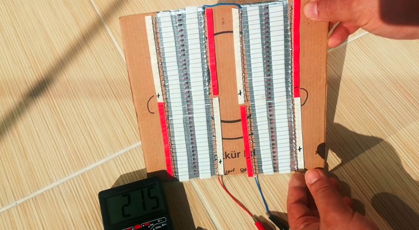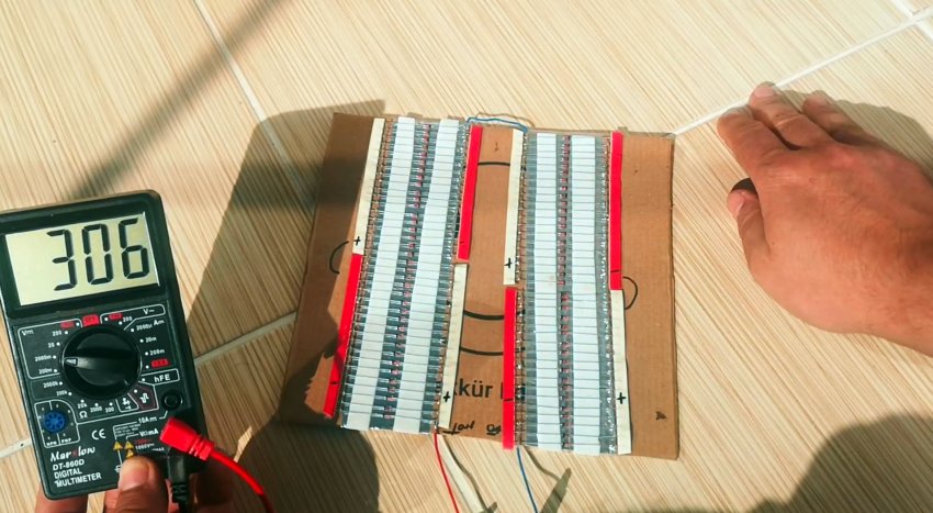 Солнечная батарея готова. Для проверки работы подключаем мультиметр на выход.