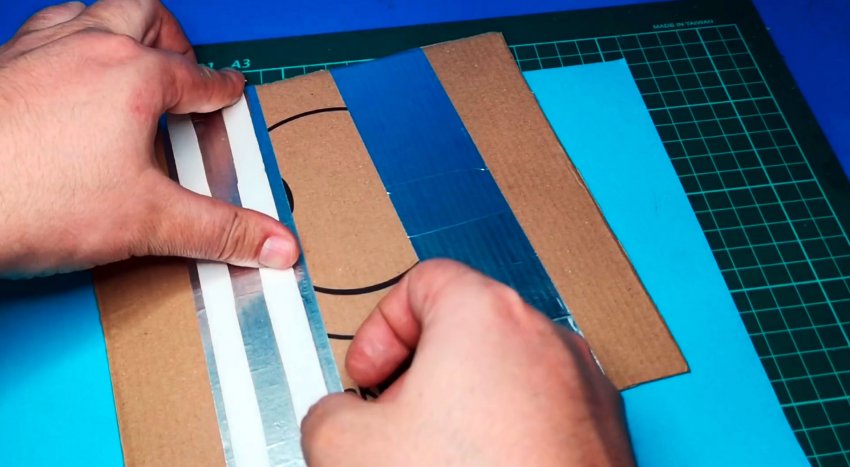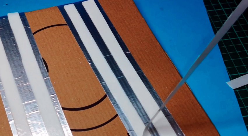 В качестве основания будет использована подложка из картона. Наклеиваем на картон две полоски фольгированного скотча - они будут служить отражателем.