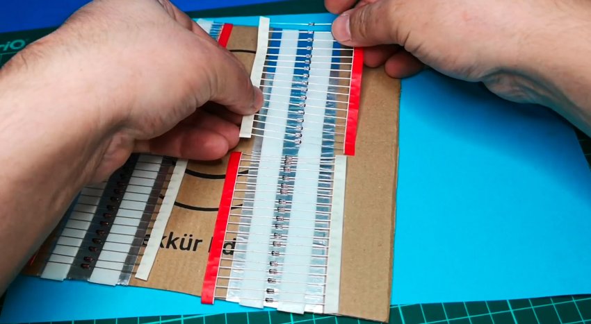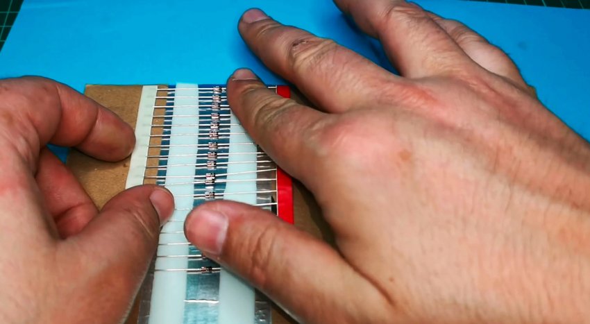 На каждую полоску наклеиваем сверху по две полосы клеящей ленты - эти будут служить подставкой под диоды.