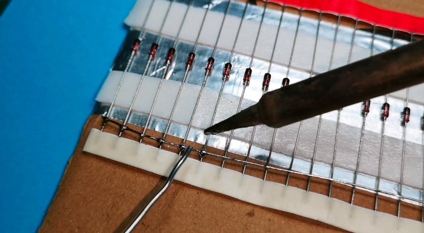Сначала спаиваем все диоды в каждой группе паралельно, а уже затем соединяем все группы последовательно «плюс» к «минусу».