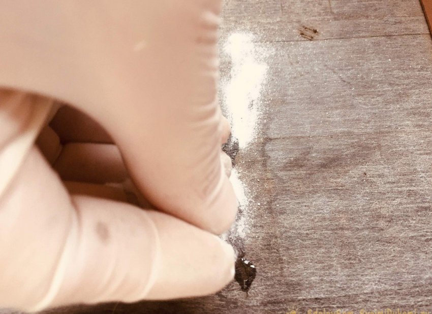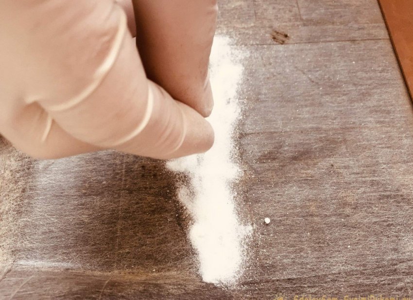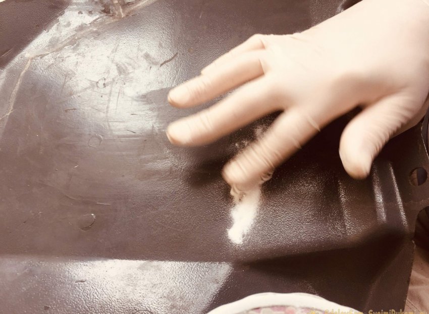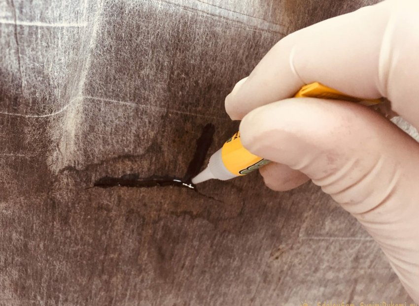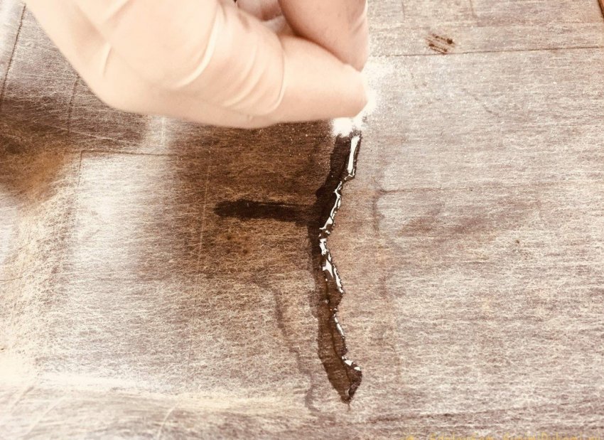 3. Вдоль трещины с лицевой стороны провёл еще одну полосу клея и обильно посыпал содой, слегка втаптывая пальцами ее в клей, а излишки смахнул.