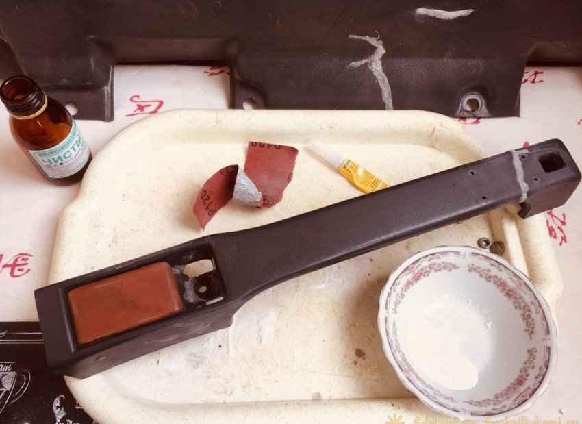 На фото 12 пластиковая панель похожа на стену пещеры с первобытным рисунком, столь сильна она была повреждена. При помощи клея и соды удалось также надежно прикрепить отломленный кусок пластика и спаять как холодной сваркой два части ручки.