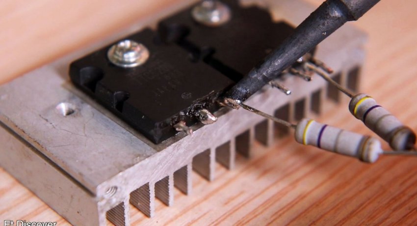 Сначала соберем усилитель навесным монтажем и проверим его работу. Припаиваем резисторы к выходным транзисторам.