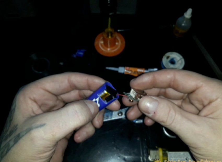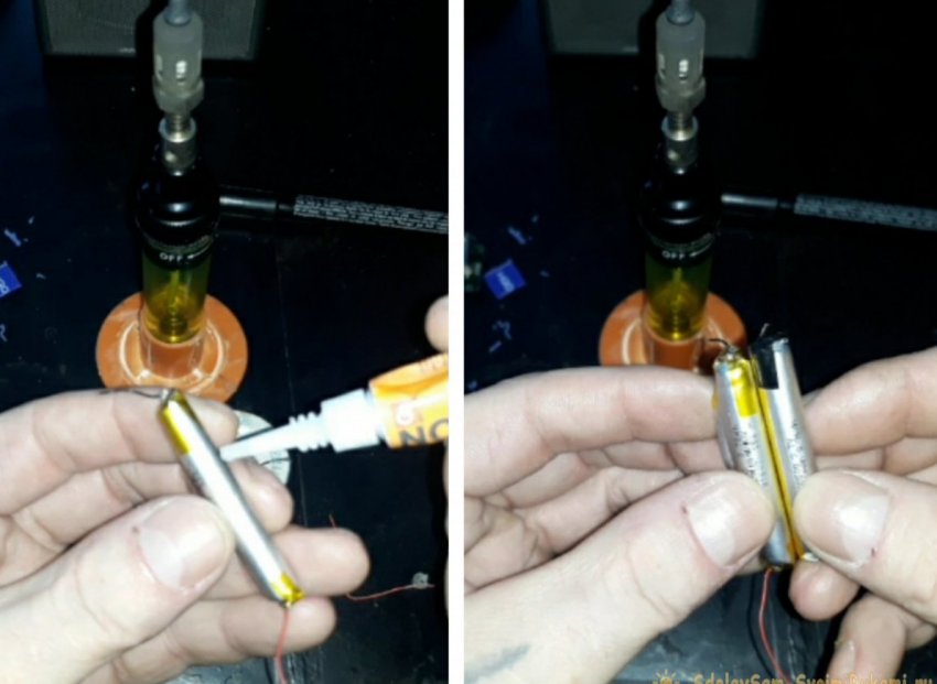 Если всё подошло, можно заняться сборкой аккумулятора. Для этого склеиваем секундным клеем оба аккумулятора. Плюс к плюсу, и минус к минусу.