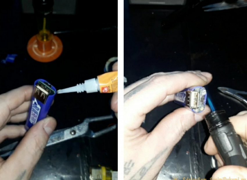 В тех местах, где стеклопластиковая основа модуля касается корпуса зарядника, капаем по капле секундного клея. Оставшиеся щели закупориваем при помощи пистолета с термоклеем.