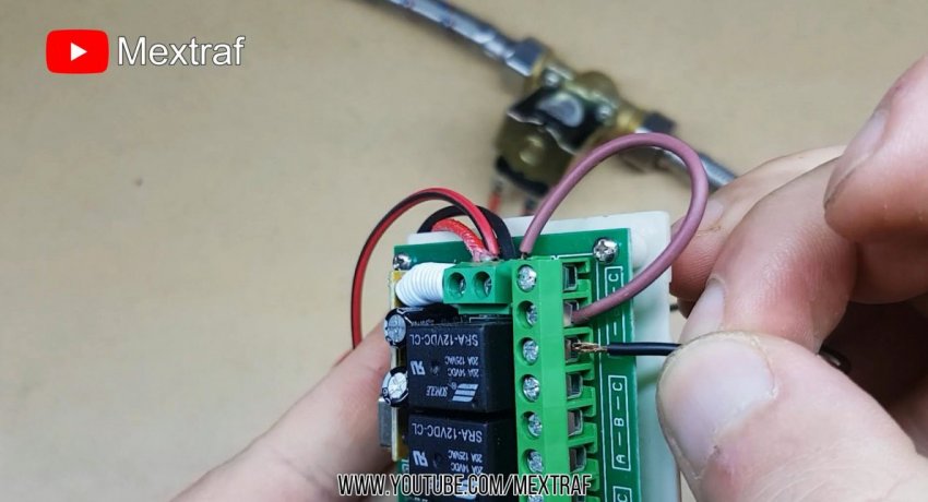 Далее подключим клапан к плюсу блока и выхода от разомкнутых контактов реле.