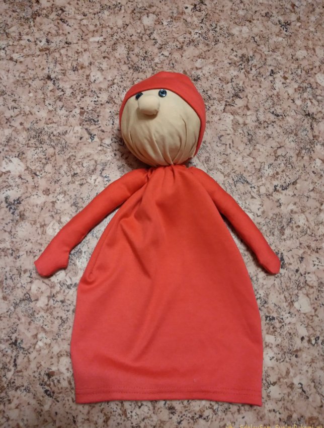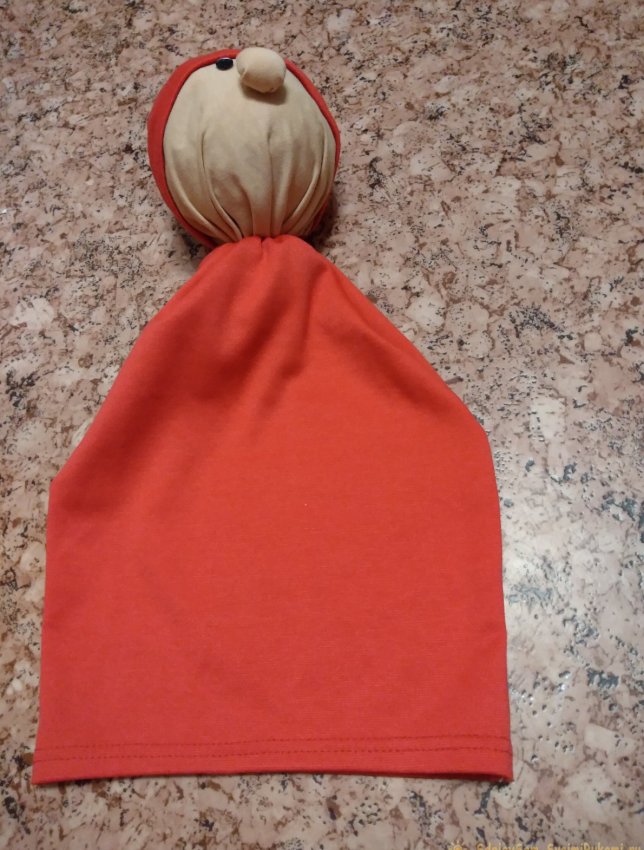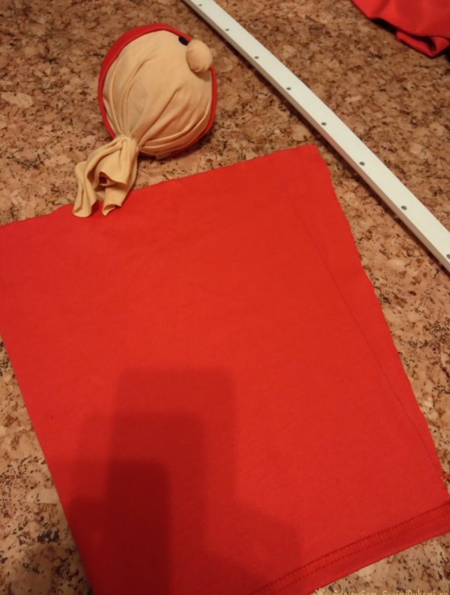 13. Сделать воротник из кусочка ткани. Для этого вырезать из красной ткани прямоугольник по объему шеи, прострочить боковой шов. Обернуть вокруг шеи и сшить вручную потайными стежками.