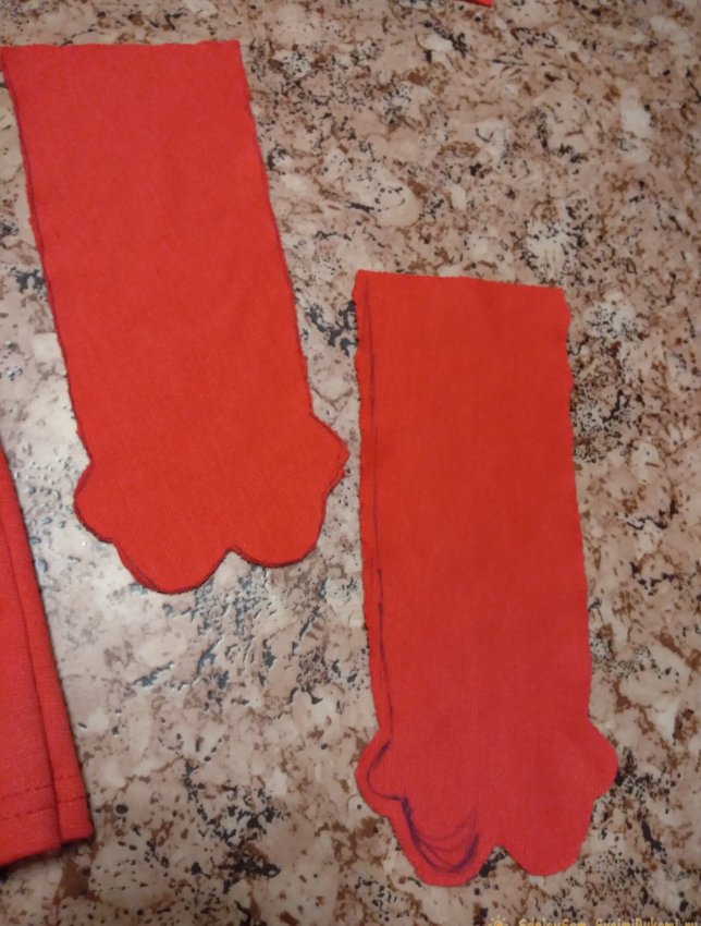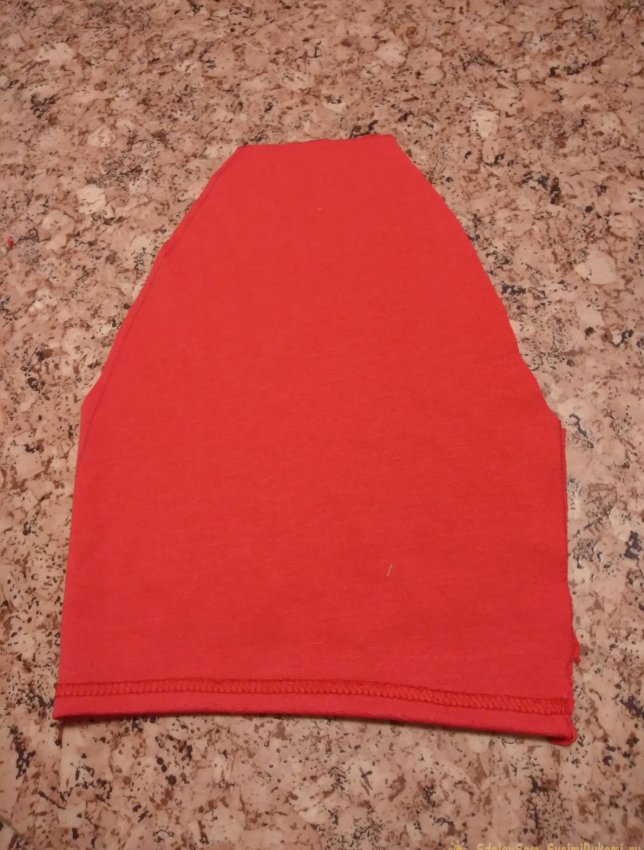 7. Из куска красной ткани сделать шубу. Отрезать прямоугольник нужного размера, подрезать с боков, формируя трапецию.