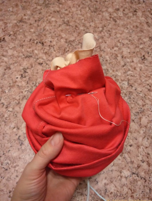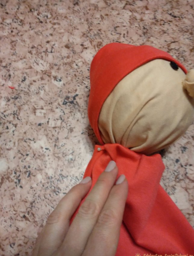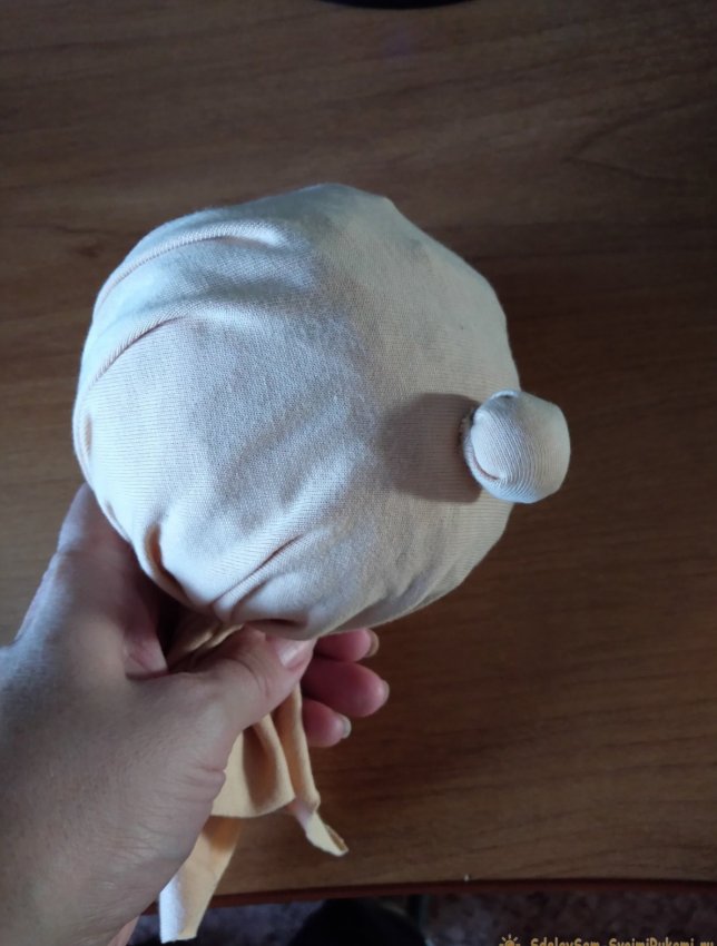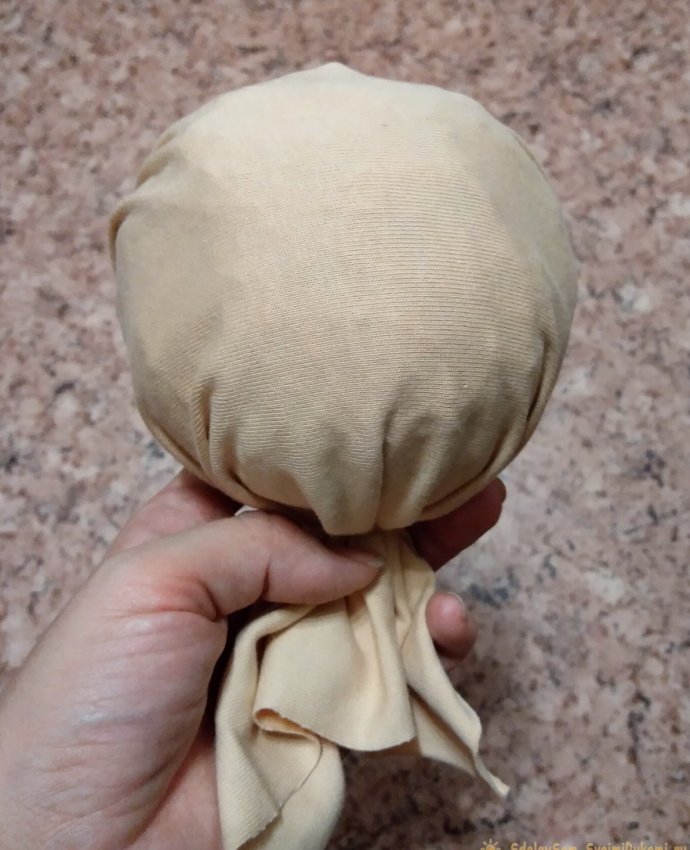 3. Обтянуть получившуюся голову бежевой тканью, формируя аккуратные складки ближе к шее. Закрепить на «шее» нитками.