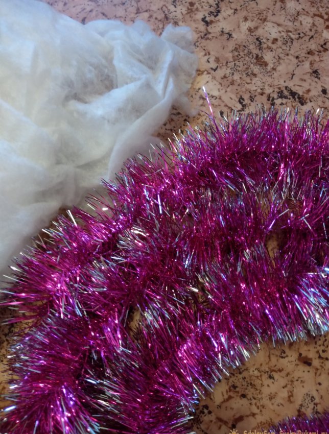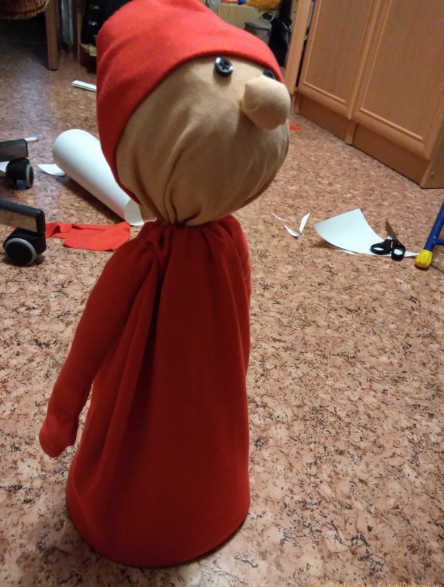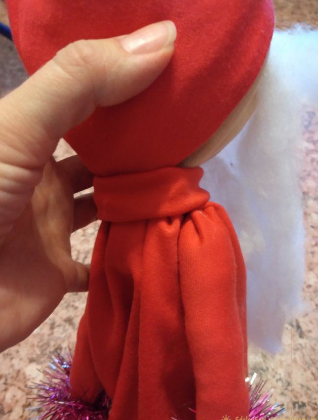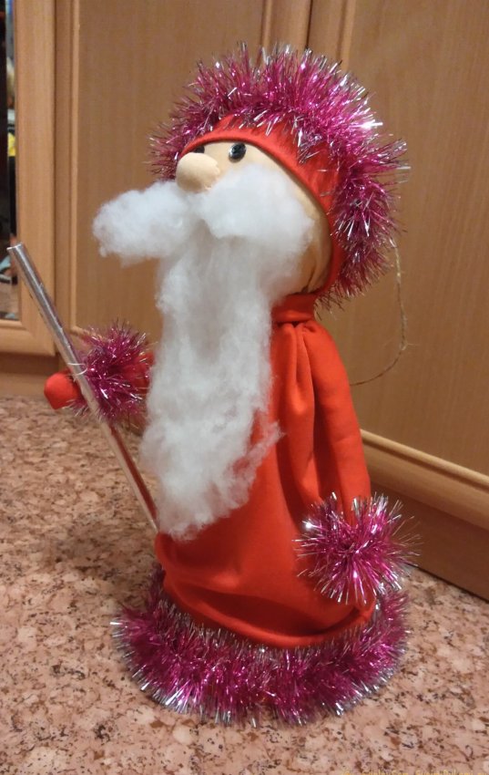 15. Пришить мишуру в нескольких местах к шапке, низу шубы и к рукам, имитируя опушку рукавиц. Прикрепить посох нитками к руке, и в двух местах снизу шубы. Для подвешивания на елку пришить нитку к голове.