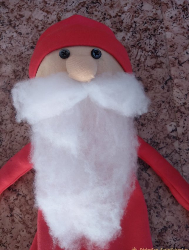 12. Сложить синтепон в два слоя, приложить к голове, отрезать нужную длину бороды, придать ей форму – обрезать с боков ножницами. Слегка подергать с краев руками, чтобы форма была плавной. Пришить верхнюю часть бороды нитками к голове. Из кусочка синтепона сформировать усы, пришить их среднюю часть к голове.