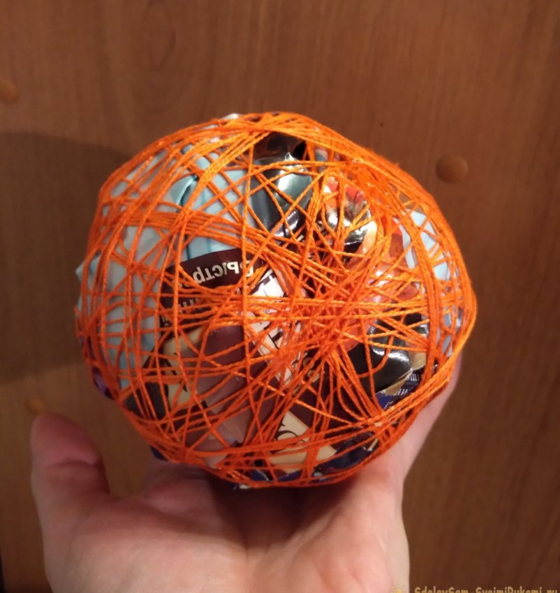 2. Обмотать шар нитками. Я брала Ирис – они более жесткие и толстые, чем обычные швейные. Наматывая нитки на бумагу, как на клубок, нужно формировать круглую форму, сравнивая неровности.