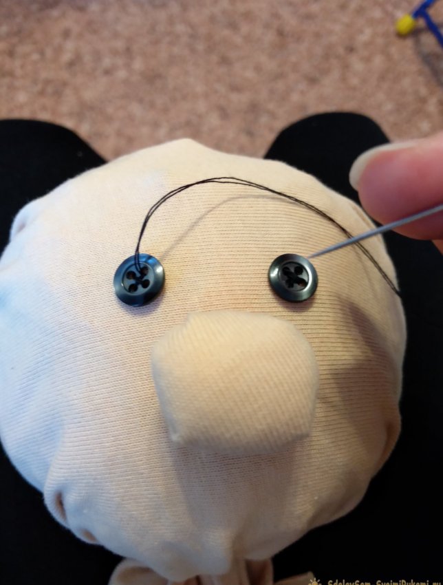 5. Приложить две пуговицы к голове, наметить место расположения, пришить. Я брала рубашечные пуговицы.