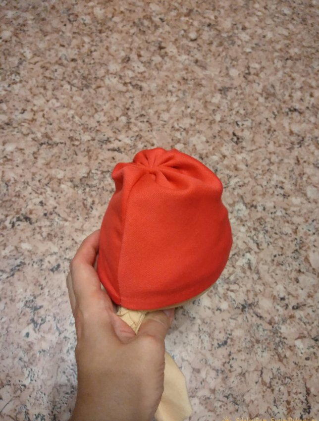 6. Сшить шапку. Куском ткани обернуть голову, отрезать нужный размер. Прострочить боковой шов, сверху стянуть ниткой. Одеть шапку, закрепить ее потайными стежками в двух местах.