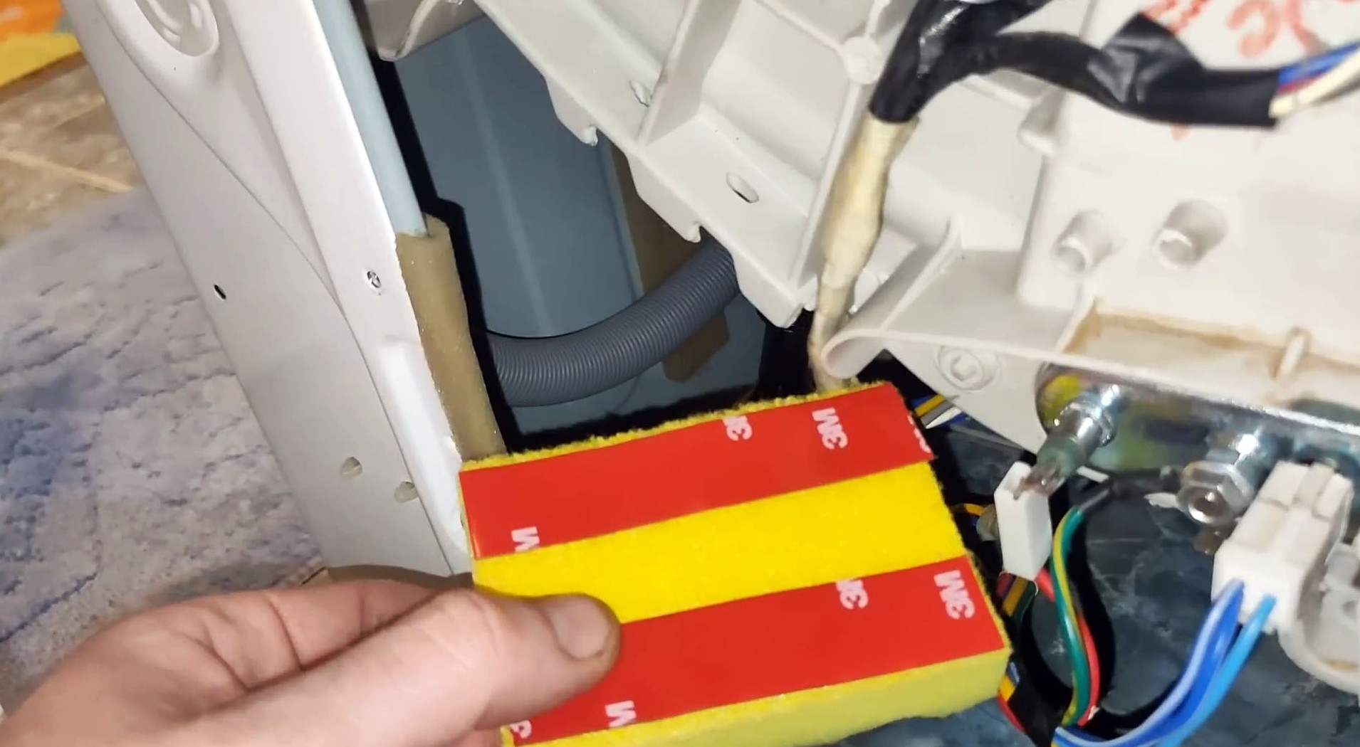 Возьмите губку и отрежьте кусочек такого размера, чтобы он закрыл место, где шланг бьётся о корпус (обычно это угол корпуса). Приклейте двухсторонний скотч к одной стороне губки.