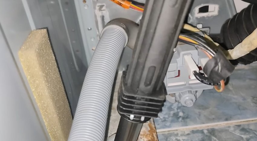 Один из амортизаторов стоит слишком близко к сливному шлангу. При отжиме амортизатор задевает шланг, который бьётся о корпус — и появляется стук.