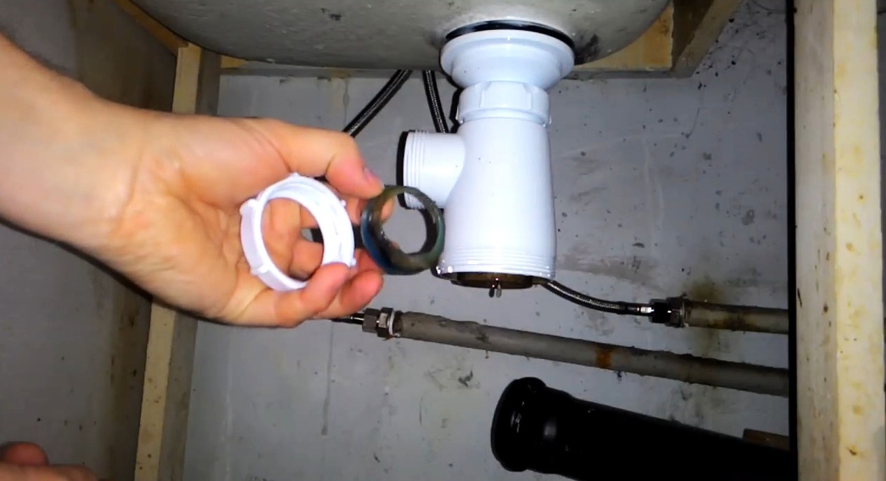 Снимаем сифон и промываем его. Ослабляем верхнюю гайку, снимаем уплотнительную резинку и саму гайку. Прочищаем всё. После промывки собираем сифон обратно: сначала гайку, затем резинку, которая идёт под конус. Вставляем сифон и слегка затягиваем гайку, чтобы он вращался.