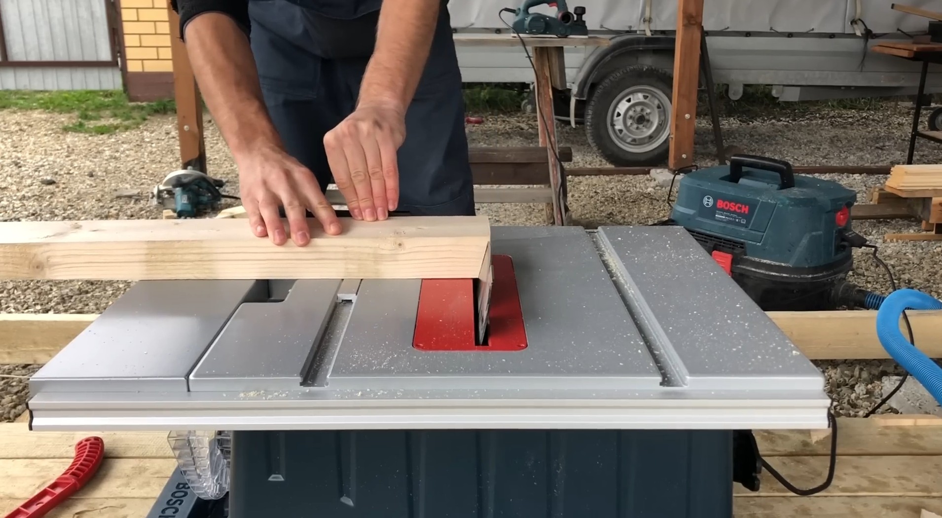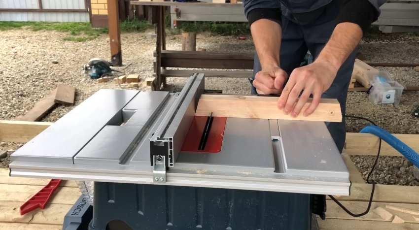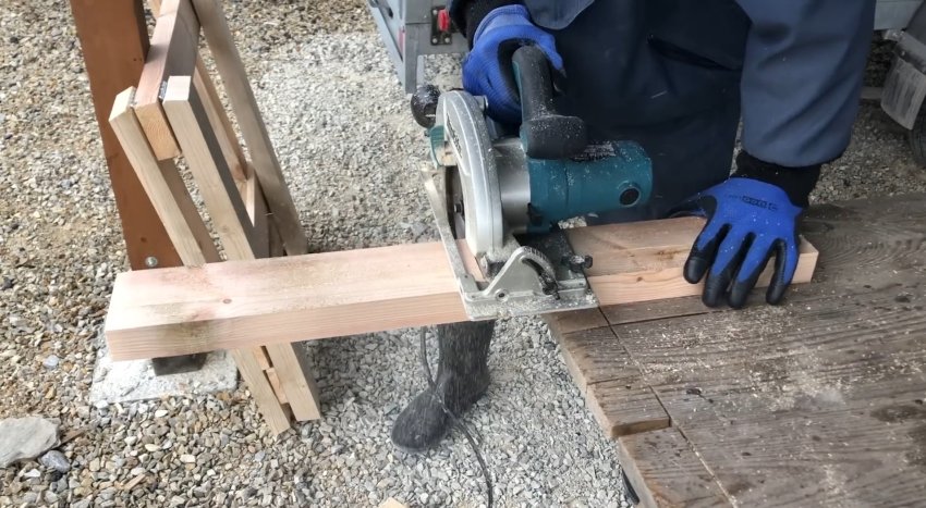 Затем выставил угол пильного диска на 15 градусов и отпилил концы досок параллельно друг другу.