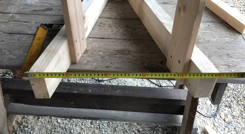 Чтобы придать конструкции жёсткость, взял доску 40 на 170 мм и распустил её пополам, получив доску 20 на 170 мм. Приложил её к ножкам, отмерил одинаковое расстояние снизу (у меня это 6 см) и прикрутил. С другой стороны сделал то же самое, только отмерил 6 см плюс ширину доски (в моём случае 16 см), чтобы при складывании поперечины не соприкасались.