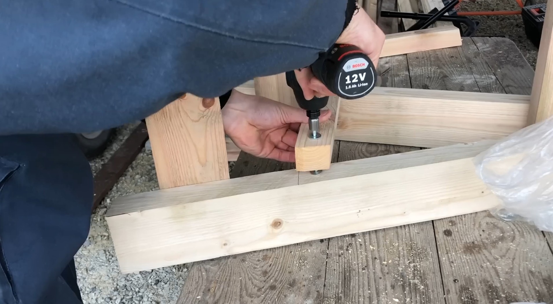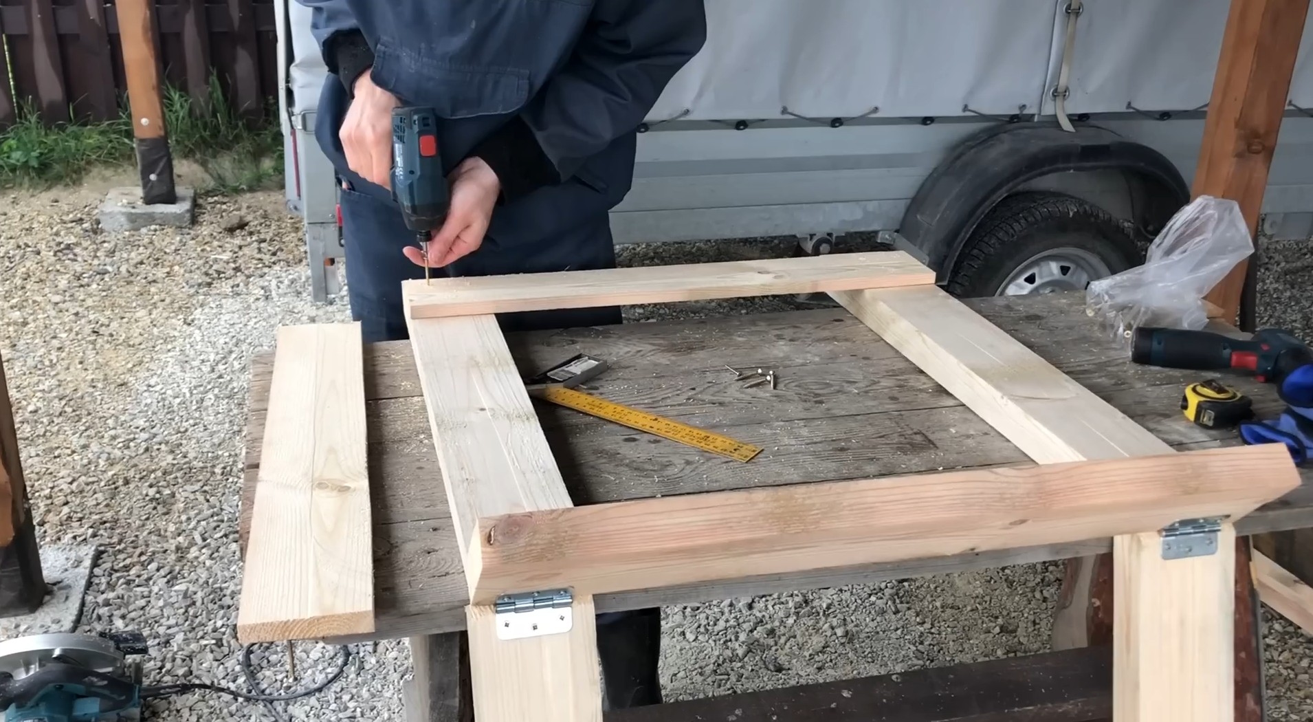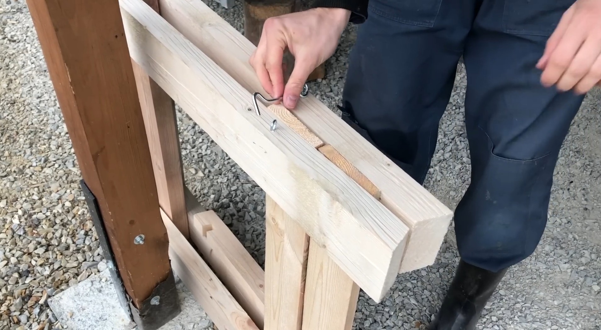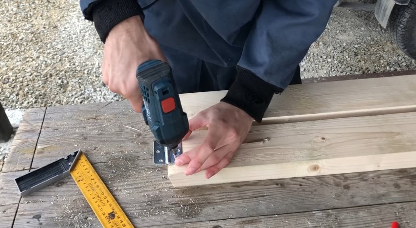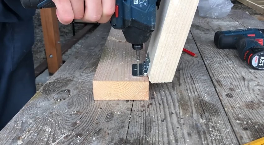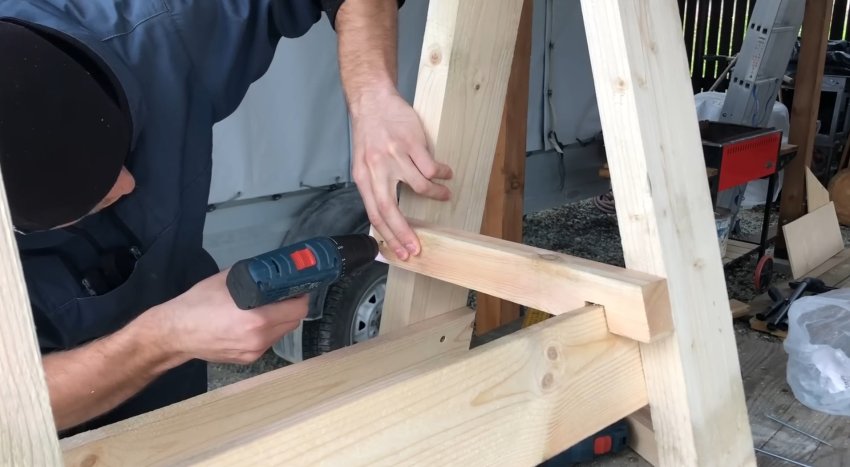 Козлы почти готовы. Осталось сделать механизм крепления ножек между собой. Первый вариант — прикрутить саморезы в перекладину, отрезав шляпку болгаркой и проделав отверстие в бруске.