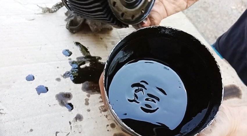 Удаляем отпиленную верхнюю часть корпуса масляного фильтра, обратный клапан, забитый грязью и другими загрязняющими ингредиентами фильтрующий элемент и перепускной клапан. Наклоняем нижнюю часть корпуса масляного фильтра с неодимовым магнитом снаружи, чтобы остатки отработанного моторного масла стекли с донной части.